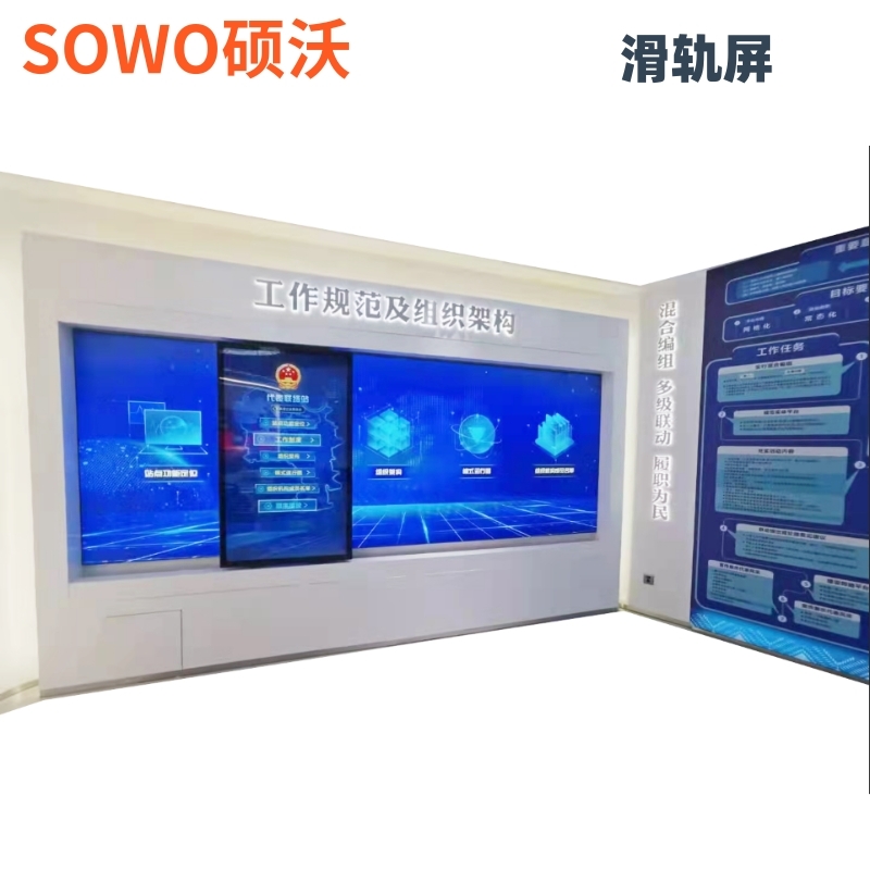 硕沃滑轨屏的可以定制嵌入式滑轨屏,外挂式滑轨屏,落地滑轨屏,吊装滑轨屏,支持运动轨迹有弧形滑轨,上下移动滑轨,直线滑轨,双排多排滑轨,同时在屏幕应用这块支持拼接屏滑轨屏,透明屏滑轨屏,触摸一体机滑轨屏,小间距LED滑轨屏。在应用效果这方面更是可以进行多种控制应用。